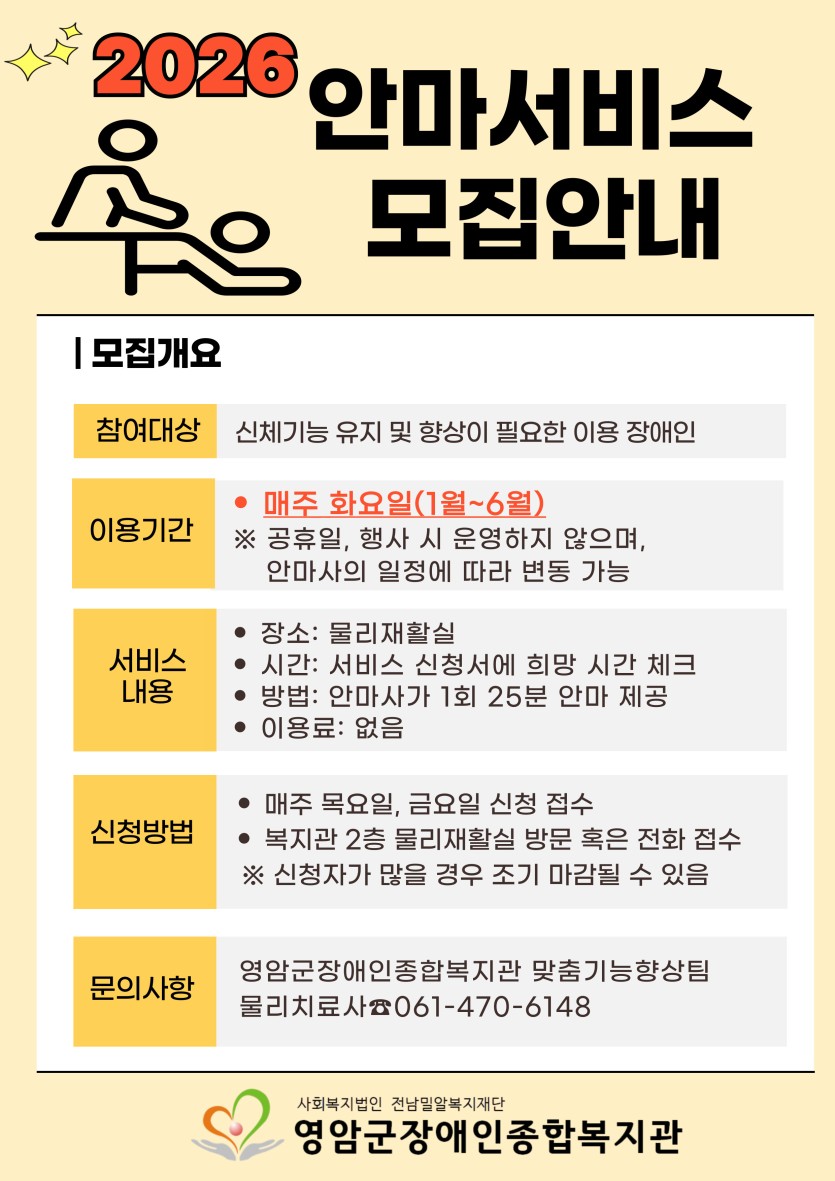 2026년 안마서비스 참여자 모집 안내 작성자 정보 맞춤기능향상팀 작성 작성일 2025.12.29 17:25 컨텐츠 정보 509 조회 목록 본문 관련자료 이전 2026년 1회차 장애인체력인증검사 참여자 모집 작성일 2026.01.09 16:06 다음 2026년 영암군장애인종합복지관 장애인일자리사업 면접 합격자 발표 작성일 2025.12.23 09:40 댓글 0 등록된 댓글이 없습니다. 로그인한 회원만 댓글 등록이 가능합니다. 목록